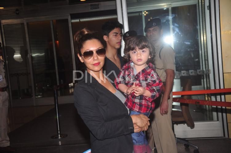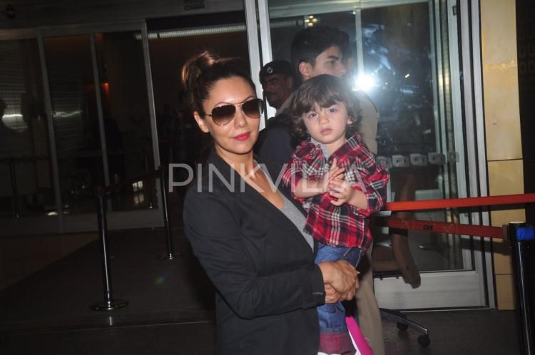 | Gauri and AbRam pose for the shutterbugs at the airport