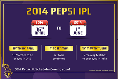 BCCI(Контрольный совет по крикету) рад сообщить, что сезон в 2014 году Pepsi IPL начнется в среду 16 апреля 2014, и завершится в воскресенье, 1 июня 2014.